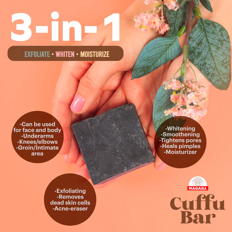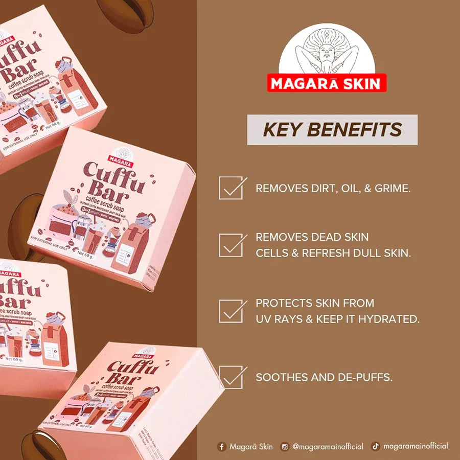 The MAGARA SKIN Cuffu Bar is a 3in1 Coffee Scrub Soap that instantly transforms your skin into a radiant and ultra-whitened canvas. Crafted from a blend of coffee grounds, licorice powder, and turmeric powder, this baby skin bar delicately eliminates dead skin cells, blackheads, and visible wrinkles.